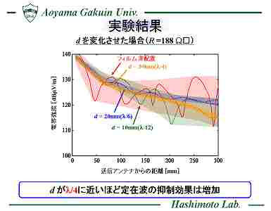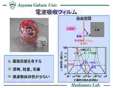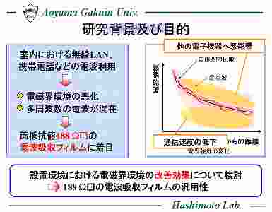 近年、室内における無線LAN、携帯電話などの電波利用が進むにつれ、電磁界環境の悪化や、多周波数の電波が混在するなどの問題が生じている。室内において電波は壁や天井で反射し、それらが干渉して定在波が生じる。すると谷の部分で通信速度の低下が生じたり、山の部分で他の電子機器に誤作動が生じたりするため、定在波の振幅を抑える必要がある。そこで我々は、周波数に依存することなく電波を吸収でき、かつ自由空間で最大の吸収量が得られる面抵抗値をもつ電波吸収フィルムに着目し、このフィルムの設置環境における有効性について検討した。
