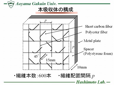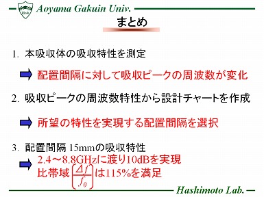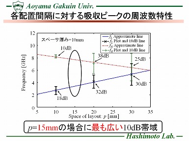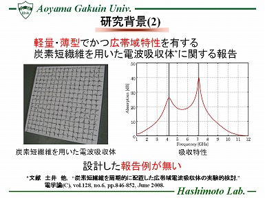 近年、電磁波利用の増加に伴い、通信速度の劣化、電子機器の誤作動などの問題が発生しており、 電波環境の悪化が懸念されている。その技術的な解決策の一例として、電波吸収体の利用が提案されているがこれらの吸収体は単一周波数に特化した構成であるため、広帯域な特性が要求される用途には不向である。そこで、炭素短繊維を周期的に配置した電波吸収体に関する検討を行ってきた。これは、非常に軽量であり厚みも薄い。さらに、本吸収体は一層型でありながら、広帯域な特性を有している。しかし、これまでに本吸収体の設計を行った例はない。よって本研究では、繊維の配置間隔に対する吸収特性の結果から、吸収ピークの周波数に着目した設計チャートを作成し、 最適な配置間隔を探索した。