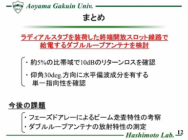 Ku帯における移動体静止衛星通信用受信アンテナとして、 2つのループ素子で構成されたダブルループアンテナが提案されている。しかし、従来の構造では反射損失が多く、また動作帯域が狭いなどの問題が挙げられる。 そこで本研究では、これらの改善を目的として、終端開放スロット線路で給電する構造を提案し、その基本特性の検討を行った。