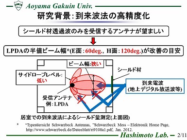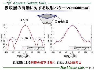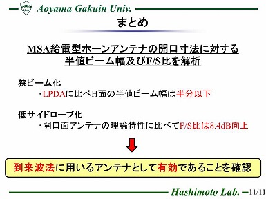 近年、地上デジタル放送波のような到来電波を用いた建材のシールド性能評価法が検討されている。 同文献で用いられているログペリオディックアンテナはビームが広いため所望波のみを受信できず、正確な評価は困難である。 従って、評価に使用するアンテナはより狭ビームかつ低サイドローブであることが望ましいが、 一般的に高利得アンテナは大型となる。そこで、本研究ではMSAを給電とするホーンアンテナ(MSA給電型ホーンアンテナと称す)について、 開口の寸法に対する、HPBW(Half Power Beam Width)及びF/S比(利得とサイドローブレベルの比)を解析し、 開口面アンテナと比較した。