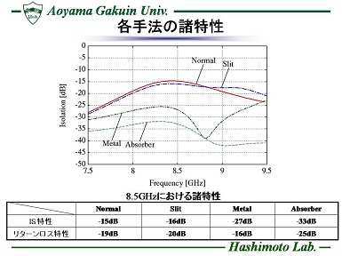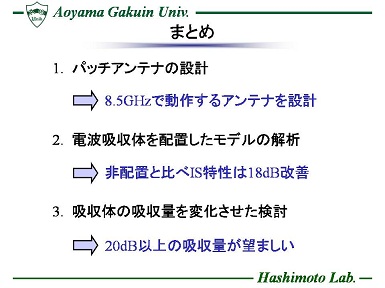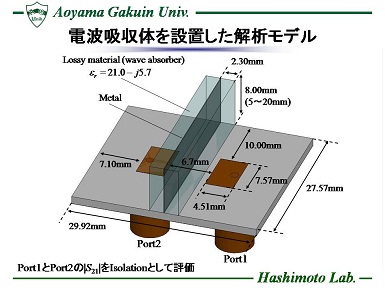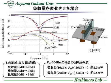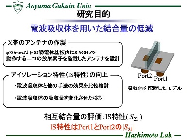 近年、航空機の通信用装置や携帯電話等の無線通信機器に搭載される回路素子の小型・薄型・集積化技術の発展に伴い、それらのシステム自体の小型・低コスト化が実現されている。 しかし小型化につれ素子間が狭まり、相互結合を起こし、所望の特性を満足しない恐れがある。 一例として、同時に動作する送信・受信アンテナは近接配置される事で、相互結合の影響をうけ、送信信号が受信側に回り込み、小さい電力の信号の受信を妨げる問題がある。 このような背景を受け、本研究では電波吸収体を用いた結合量の低減に着目し、X帯で使用される通信システムを想定し、アンテナを作成してアイソレーション特性の向上を検討する。