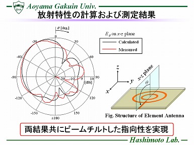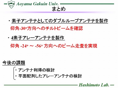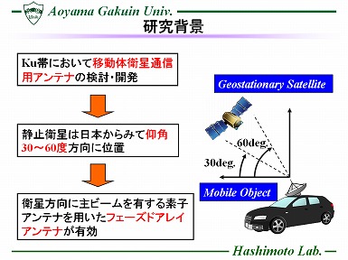 近年、Ku帯においてアンテナを用いた移動体衛星通信に関する研究が注目されている。 一般に陸上移動体用の衛星は天頂方向には存在せず、 日本において衛星は仰角約30~60度方向に 位置しているため、効率よく衛星との通信を行うためにはアンテナの主ビームもそちらの角度に向いていることが望ましい。 この要求を満たす一例として、反射板付ダイポールアンテナを用いたフェーズドアレーアンテナが報告されているが、アンテナを反射板から約半波長程度の高さに配置する必要があり、自動車等に設置する移動体用アンテナとして用いるには厚くなるといった欠点がある。 そこで、本研究では薄型化が期待でき、かつビームチルトした単一指向性を有する 素子アンテナに着目し,直線偏波を有するダブルループアンテナを提案する。