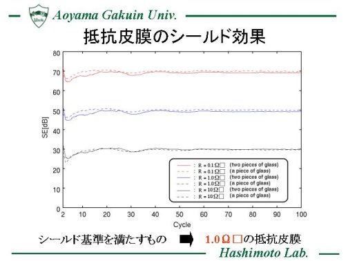 電子レンジのドア窓は、パンチングや金属メッシュを施して、庫内内部から漏洩する電波をシールドするとともにドアの透明性を高めている。 しかし、この構成では、金属の影響で庫内の透明度が低下し、さらにシールドの問題からこれ以上の透明度を期待することは困難である。 そこで、透明性導電膜(抵抗皮膜)に着目し、電子レンジのドア部に窓ガラスとして適用した場合のシールド性能について、FDTD法により解析的に検討した。その結果、面抵抗値の変化に対するシールド効果を定量的に確認するとともに、実用性を考慮した場合の具体的な指針を示すことができた。