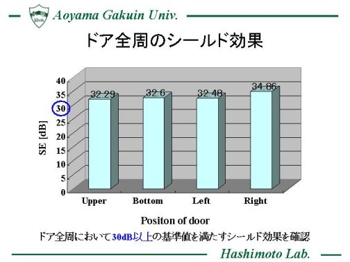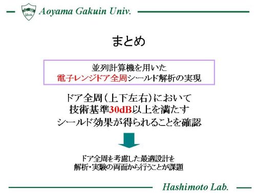 電子レンジのドア部におけるチョーク構造について設計を行う際には、ドア上部やコーナー部を含めた全周において総合的にシールド性能の評価を行う必要がある。 そこで、大規模な電磁界解析を実現可能とした並列計算機を使用し、量産型電子レンジに使用されるドアシールド全周構造のモデル化を並列FDTD法により行い、ドアの上下左右全体でのシールド性能に関する基礎検討を行った。 この結果、全体で実用上の基準を満たす30dB以上のシールド効果が得られることを定量的に確認した。