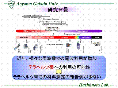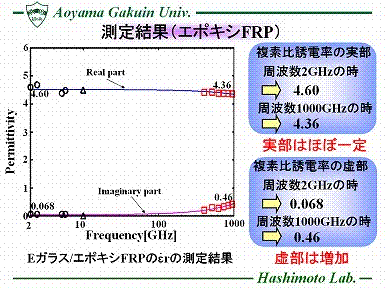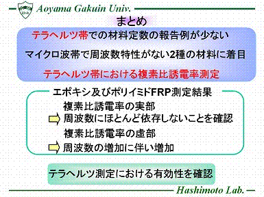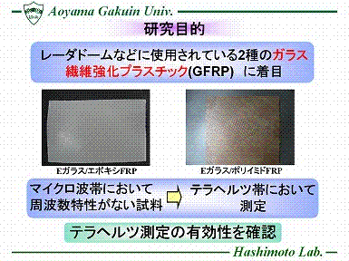 近年、様々な周波数での電波利用が増加し、電波が飽和状態になっているため、今後はさらに高帯域の空き電波が必要になっている。 そこで、テラヘルツ帯の利用の可能性について着目した。しかしこれまで、テラヘルツ帯は技術的手段が未熟だったため未開拓領域とされていた。 そこで、本研究ではテラヘルツ帯における材料定数測定の先駆けとして2種のガラス繊維強化プラスチック(GFRP)に着目し、テラヘルツ測定の有効性を確認した。