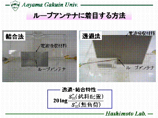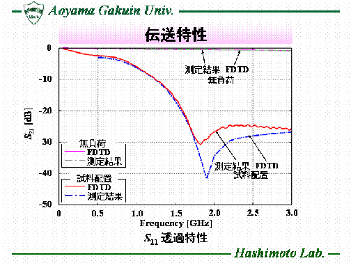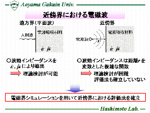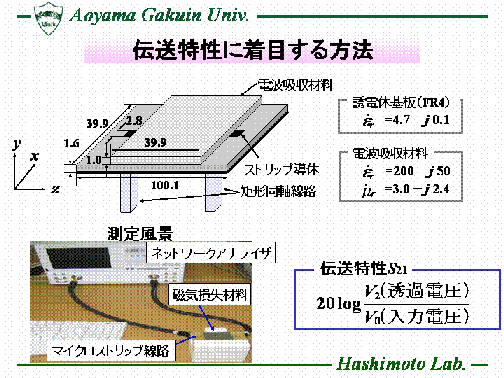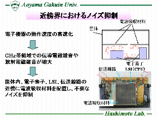 近年、電子機器の動作速度の高速化に伴い、回路基板等からの伝導ノイズや放射ノイズが増大し、 電子機器の誤作動や性能劣化の原因となっている。これらの問題を解決するため、電子機器の筺体内や素子の近傍に電波吸収材料を配置し、不要な電磁波を抑制することが重要となる。本研究室では、近傍電磁界に用いる電波吸収材料の評価法として、ループアンテナを用いる評価法とマイクロストリップ線路を用いる評価法に着目し、FDTD法を用いた電磁界シミュレーションや、製作した測定治具を用いた実験により検討を行っている。
