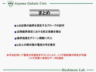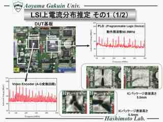 我々は、基盤からの放射ノイズ源を特定する目的で,基板上の電流分布をグリーン関数法によって推定する手法を提案してきた。本研究では、LSI上の電流分布を推定することを目的とし、LSI近傍のでの磁界測定をするためのプローブの試作及び校正、試作したプローブを用いてLSI近傍の磁界を測定を行い、測定結果からLSI上の電流分布を推定した。結果として、本手法がノイズ放射源の特定が可能であることを示した。。