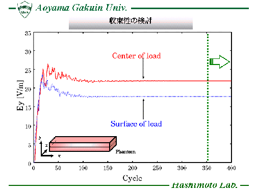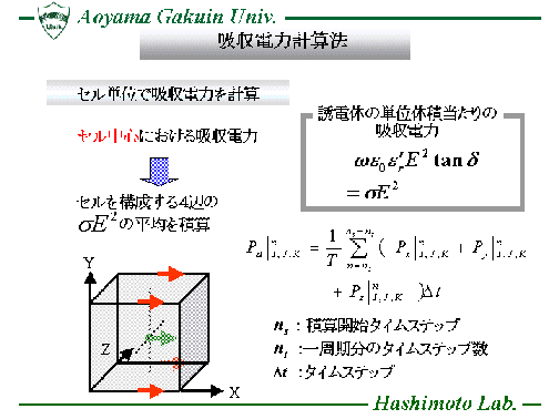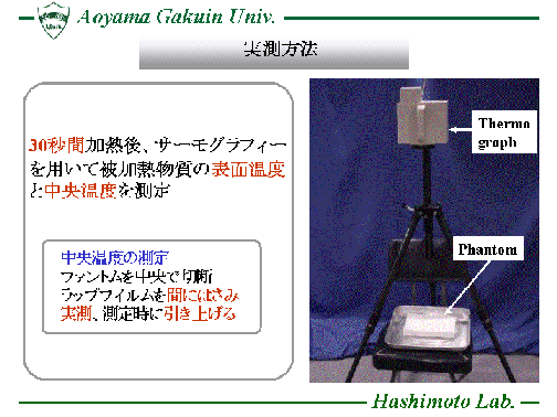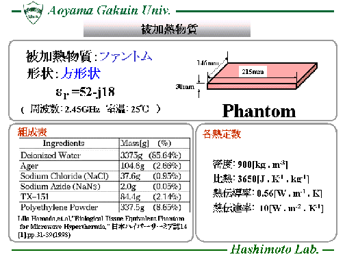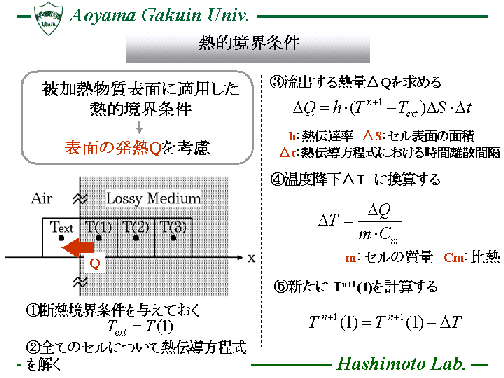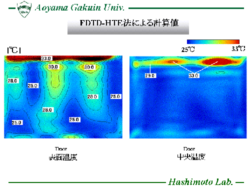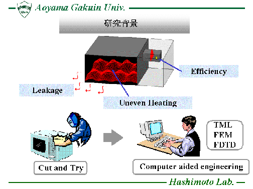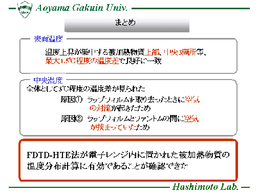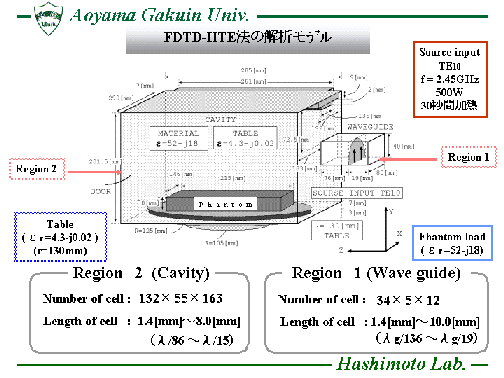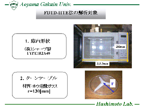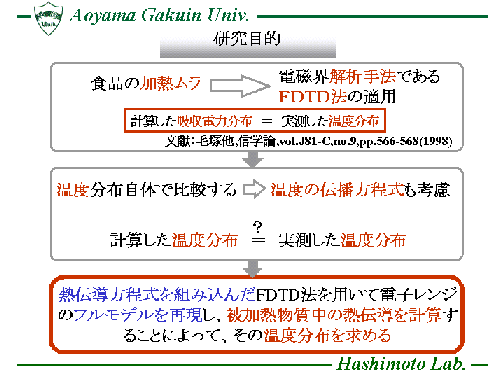 熱伝導方程式(Heat Transport Equation)を時間領域差分法(FDTD法)に 組み込んだ数値解析手法(FDTD-HTE法)を用い、電子レンジ内に置かれた 被加熱物質の表面温度分布を計算し、効率的な食品加熱に対する 電子レンジの設計等に役立てています。