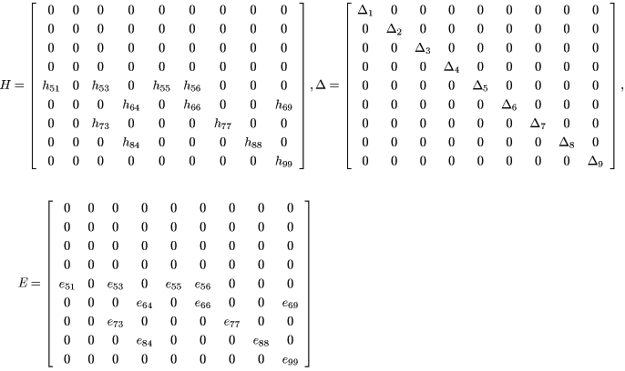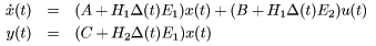 と書ける。ここで、行列H, Eは既知であり、不確かさの大きさを表現できる。したがって、システムパラメータに不確かさを含むシステムは以下のような方程式で記述される。