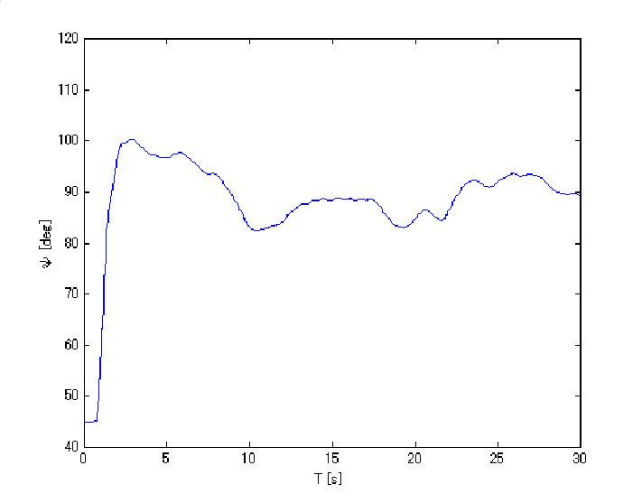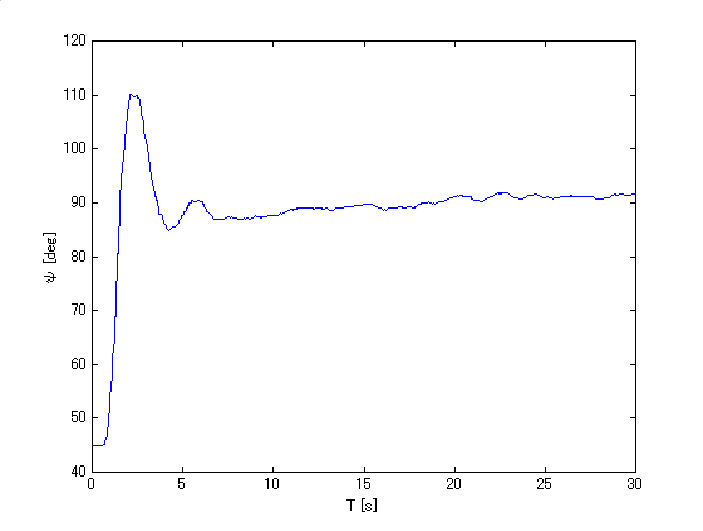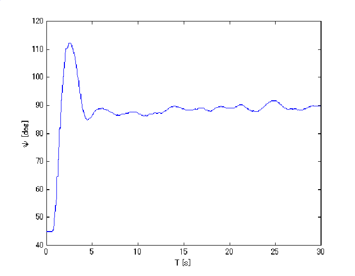 このような不確かさを含むシステムの二次安定化制御を考察する。以下に、ヘリコプタを用いた制御結果を示す(動画は下線をクリック)。仰角を水平方向(90度)の姿勢で制御することを目標としている。
